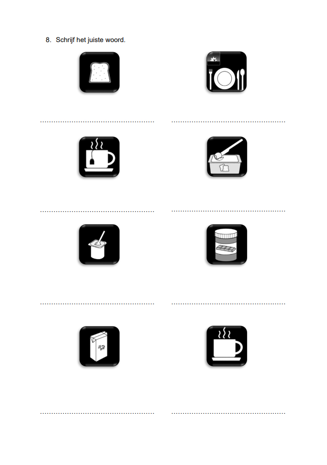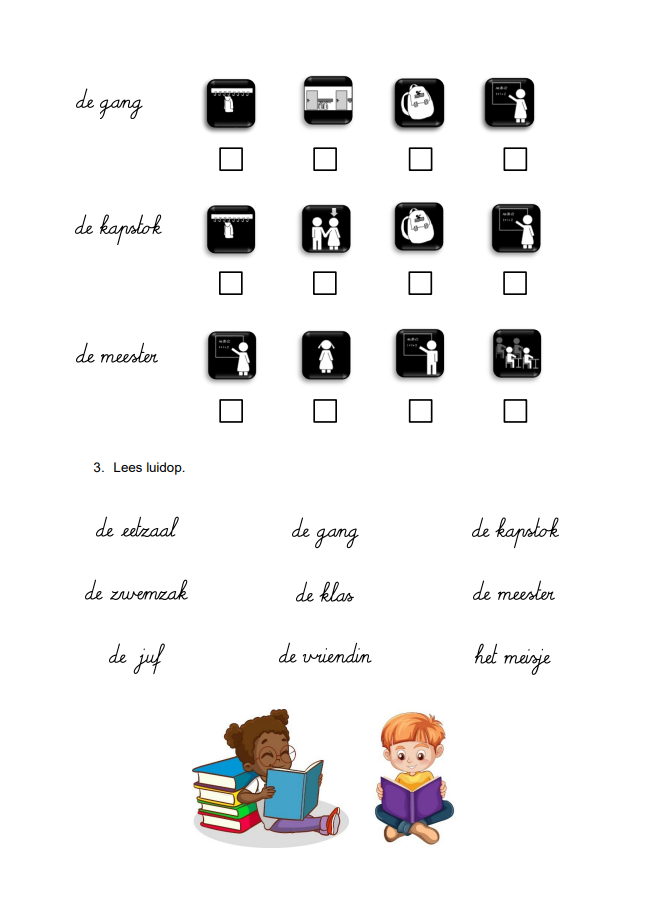 Alle inoefenbundels kennen dezelfde opbouw met dezelfde activiteiten, namelijk: woorden overschrijven, woord koppelen aan pictogram, voorlezen, pictogrammen verbinden met het juiste woord, pictogrammen herkennen, lettersoep, kruiswoordraadsel.
